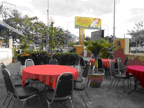 ลานด้านนอก สำหรับนั่งกินข้าวฟังเพลง ถือเป็นแหล่งพักผ่อนหย่อนใจยามค่ำของชาวปากเซ มีข้อสังเกตว่าเขาจัดที่ข้างในให้เรานั่งเป็นสัดส่วน โดยใช้ผ้าม่านโปร่งสีขาวเป็นตัวกั้น ไม่ได้ทำเป็นห้องๆเหมือนเมืองไทย